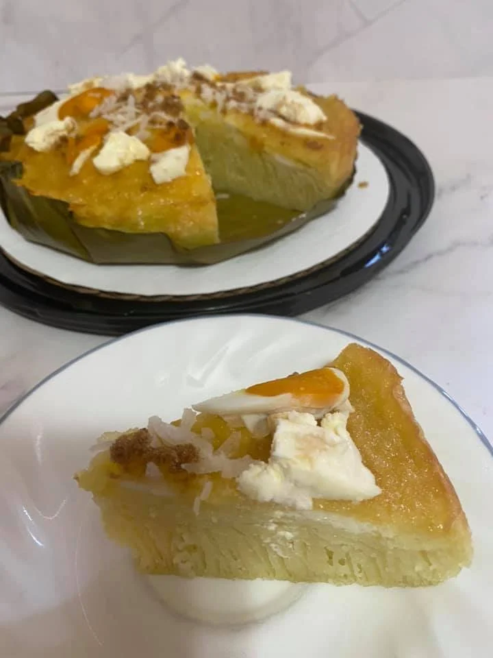 Combination of rice and glutinous rice flour, salty duck egg and cream cheese filling and topping, desiccated coconut with sprinkle of brown sugar, in Ube flavor.